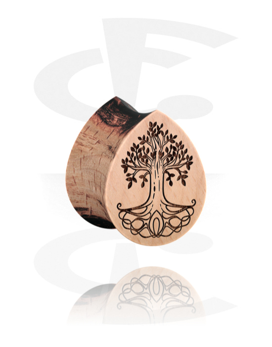Plug z dwoma ściankami w kształcie łezki (drewno) z grawerem laserowym „drzewo”