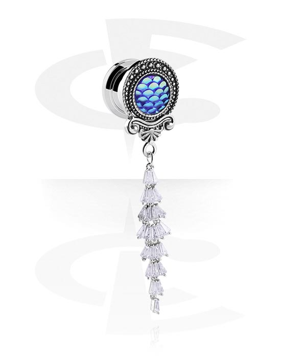 Tunel z odkręcaną ścianką (stal chirurgiczna, srebro, błyszczące wykończenie) z wzorem łuski ryby i wisiorkiem