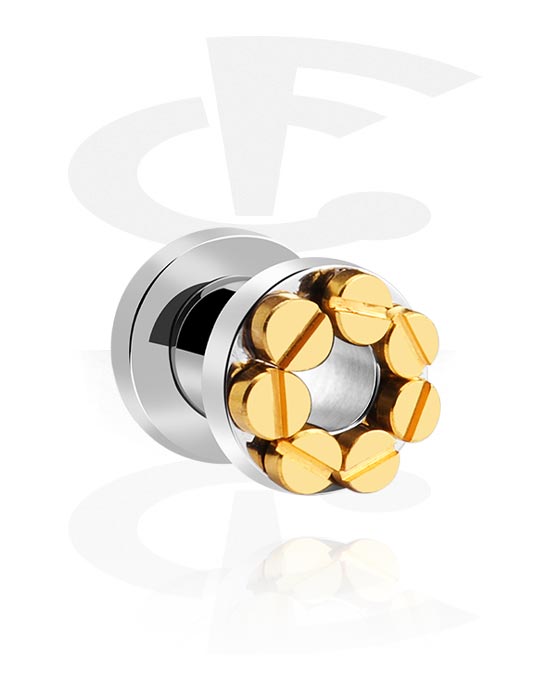Flesh tunnel made of surgical steel with shiny golden screw heads. Comes with a threaded back for easy insertion.