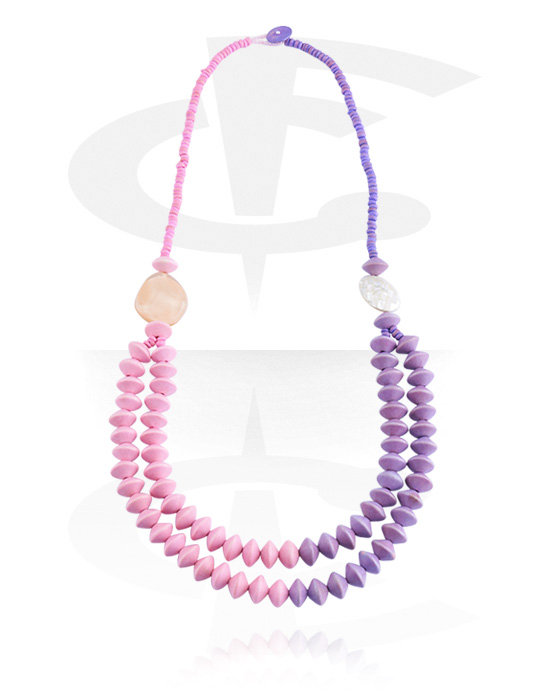 This necklace is made from wood and shell.
