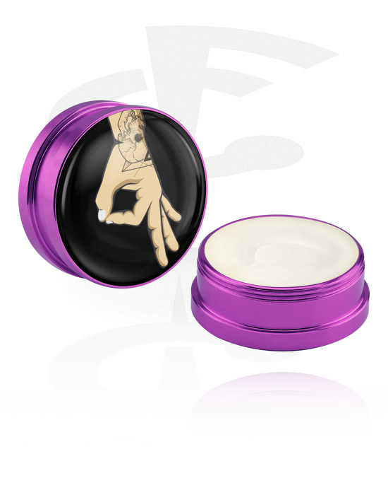 High quality jewelled container in a plug-like look, made of anodised aluminium. Available in various colours and designs. The deodorising conditioning creme takes care of your stretched earlobes and prevents bad smells. After a quick and easy application, the natural ingredients provide optimal skincare and nice smells.