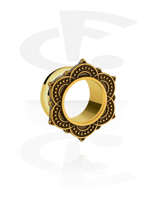 A plug é feita de aço cirúrgico banhado a ouro de alta qualidade . Os enfeites na frente do piercing lembram uma flor .