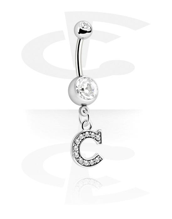 Krúžok do pupku (chirurgická oceľ, strieborná, lesklý povrch) s príveskom s písmenom „C“ a kryštálové kamene