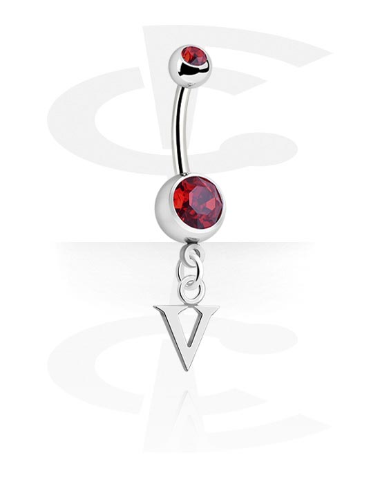 Krúžok do pupku (chirurgická oceľ, strieborná, lesklý povrch) s príveskom s písmenom „V“ a kryštálové kamene