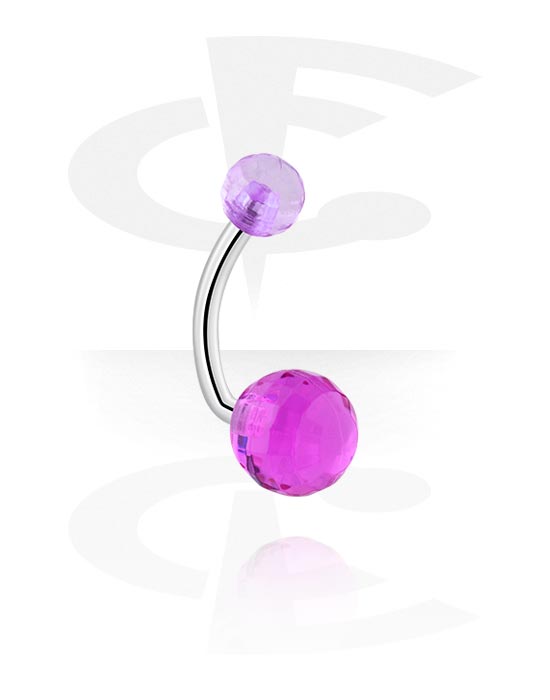 This curved barbell made of surgical steel features two faceted spheres made of acrylic. Available in different colours. Have a look and take your pick.