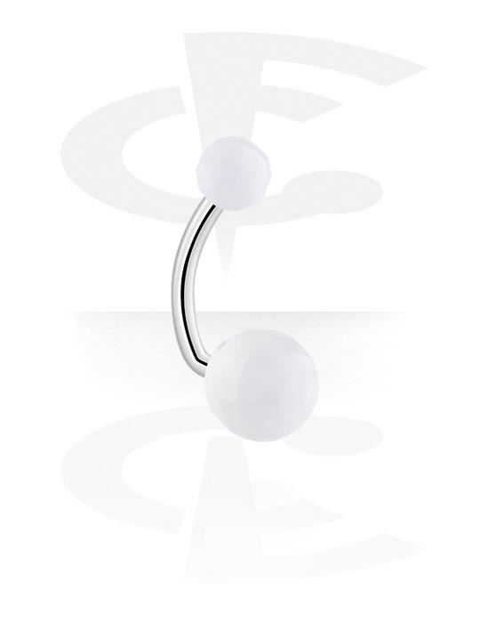 This curved barbell made of surgical steel features two faceted spheres made of acrylic. Available in different colours. Have a look and take your pick.