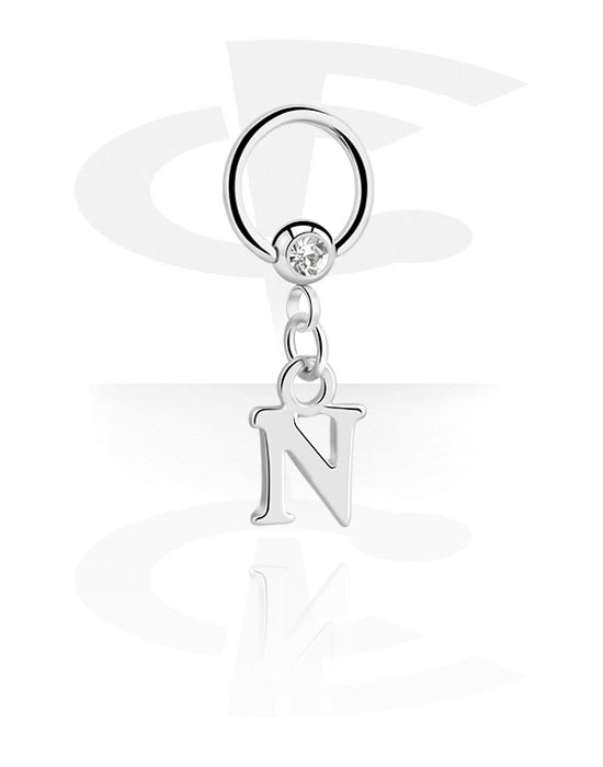 Krúžok s guľôčkou (chirurgická oceľ, strieborná, lesklý povrch) s Kryštálový kameň a príveskom s písmenom „N“