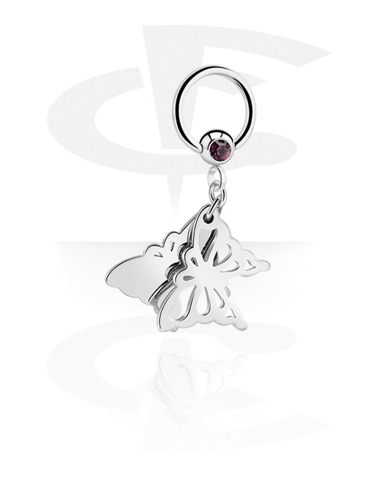 Krúžok s guľôčkou (chirurgická oceľ, strieborná, lesklý povrch) s Kryštálový kameň a Prívesok motýľ