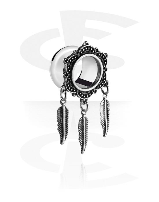 Tunel s rozšírenými koncami (chirurgická oceľ, strieborná, lesklý povrch) s vintage dizajnom a prívesok pierko