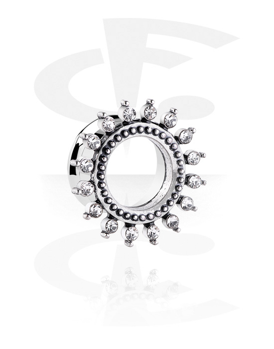 Tunel s rozšírenými koncami (chirurgická oceľ, strieborná, lesklý povrch) s vintage dizajnom a kryštálové kamene