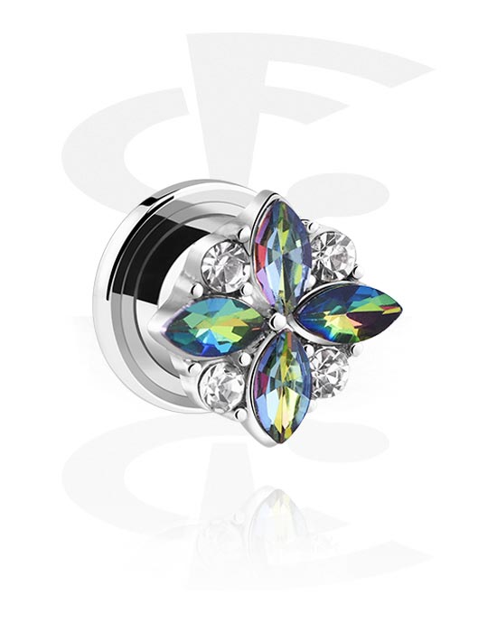 Skrutkovací tunel (chirurgická oceľ, strieborná, lesklý povrch) s dizajnom kvetina a kryštálové kamene