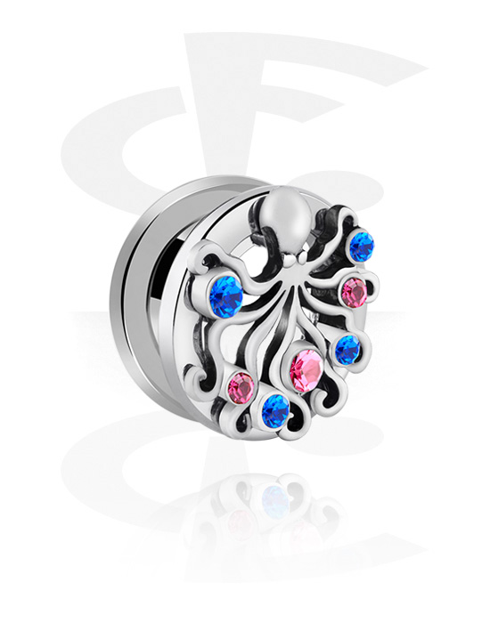 Skrutkovací tunel (chirurgická oceľ, strieborná, lesklý povrch) s Motív chobotnica a kryštálové kamene