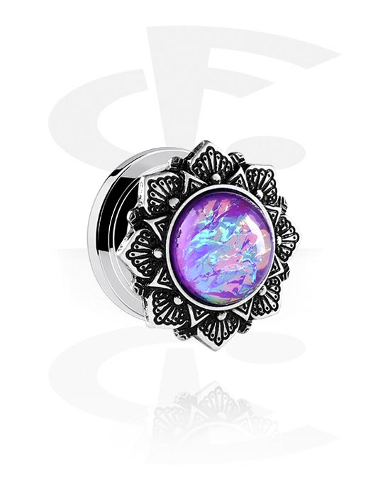 Skrutkovací tunel (chirurgická oceľ, strieborná, lesklý povrch) s dizajnom kvetina a farebným viečkom