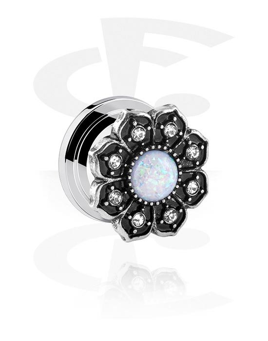 Skrutkovací tunel (chirurgická oceľ, strieborná, lesklý povrch) s dizajnom kvetina a kryštálové kamene