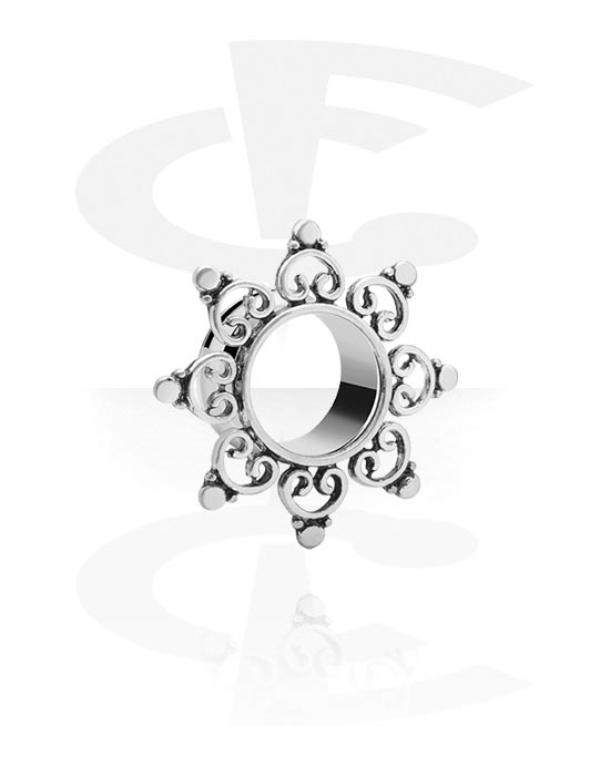 Tunel s rozšírenými koncami (chirurgická oceľ, strieborná, lesklý povrch) s vintage dizajnom