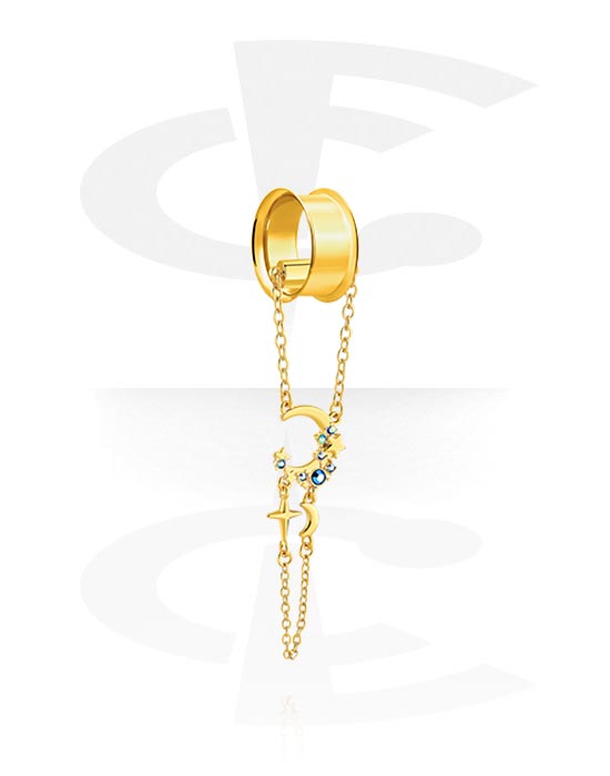 Tunel s rozšírenými koncami (chirurgická oceľ, zlatá, lesklý povrch) s Motív polmesiac a kryštálové kamene