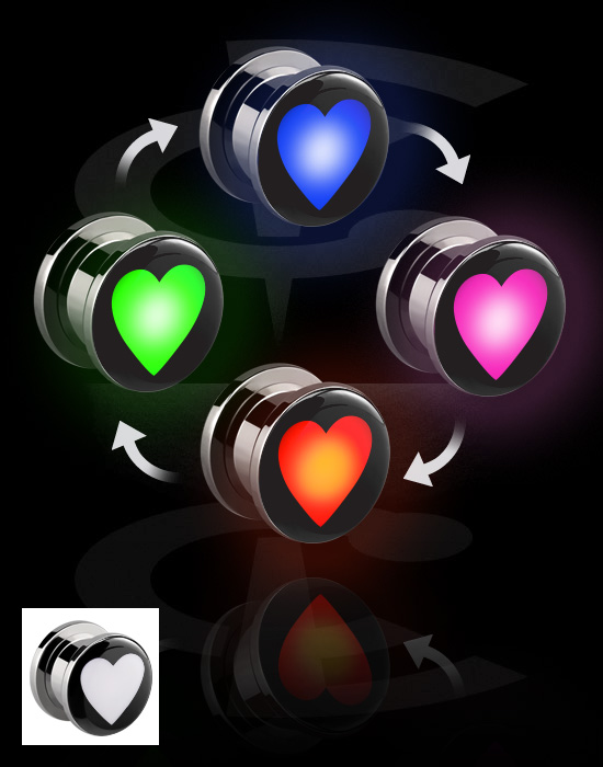 Skrutkovací tunel (chirurgická oceľ, strieborná, lesklý povrch) s LED koncovkou a Motív srdca