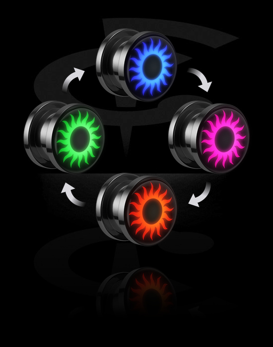 Skrutkovací tunel (chirurgická oceľ, strieborná, lesklý povrch) s LED koncovkou a dizajnom slnko