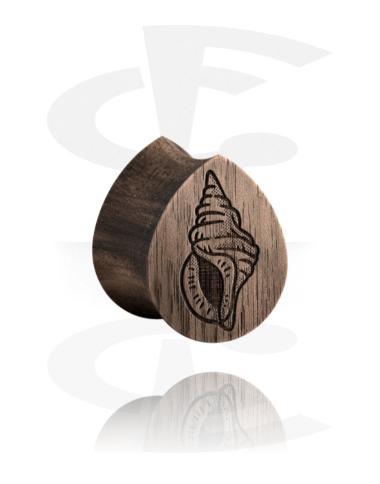 Plug s rozšírenými koncami v tvare slzy (drevo) s laserovým gravírovaním „mušľa“