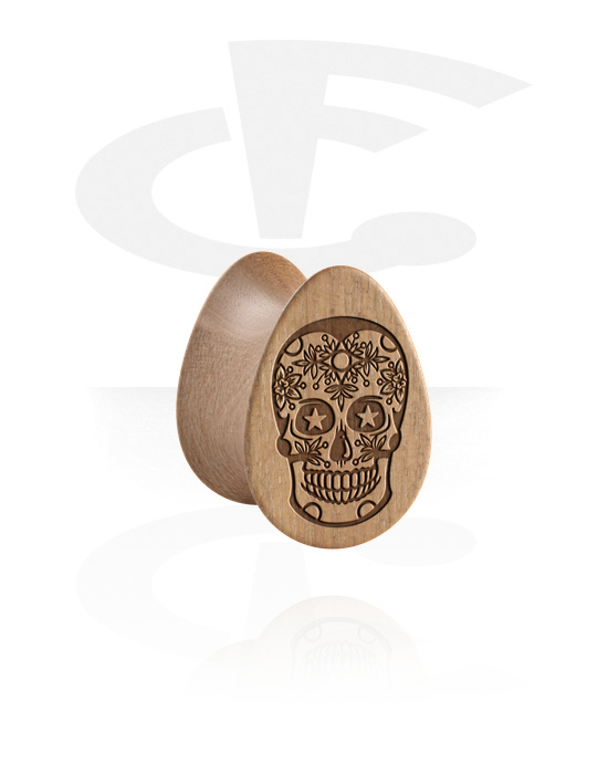 Plug s rozšírenými koncami v tvare slzy (drevo) s dizajnom cukrová lebka „Dia de Los Muertos“