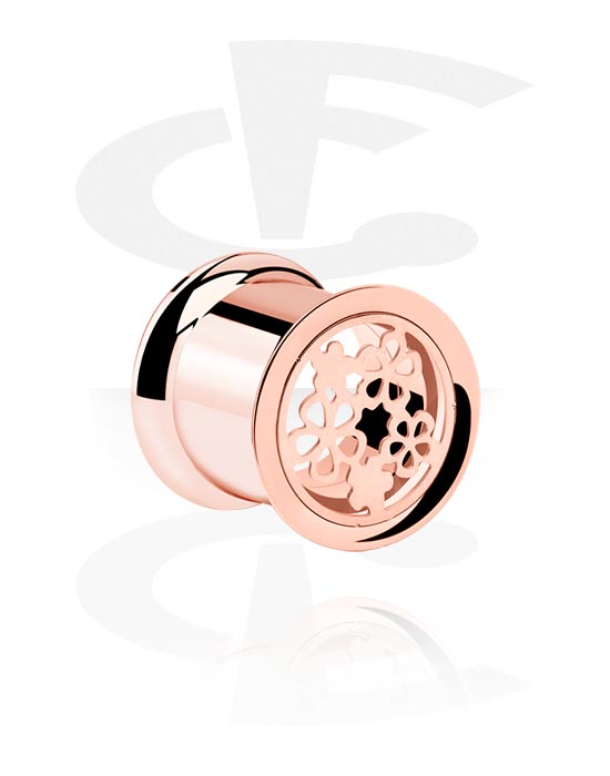 Tunel s rozšírenými koncami (chirurgická oceľ, ružové zlato, lesklý povrch) s dizajnom kvetina