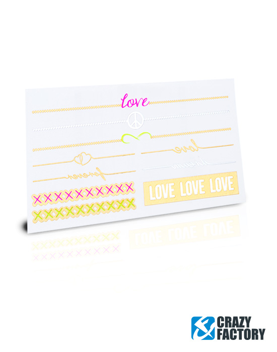 Temporary tattoo. Applied with water and holds for a couple of days. Can be removed easily. Our Neon-Tattoos glow in bright, intense colours when exposed to blacklight (UV-light). The perfect highlight for a night out!
