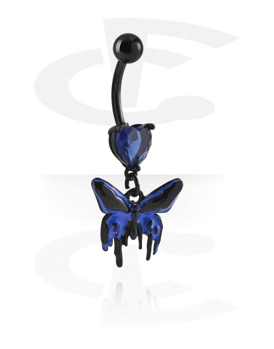 Rinka za popek (kirurško jeklo, črna, sijoč zaključek) s/z Kristalno srce in Obesek metulj