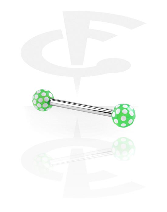 Barbell made of surgical steel with a dotted acrylic ball at each end. Available in different colour combinations. Beautifully wacky!