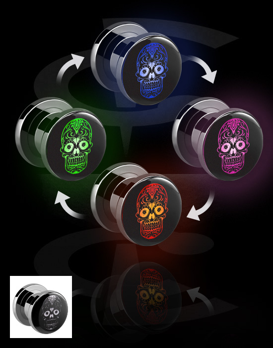 Navojni tunel (kirurško jeklo, srebrn, sijoč zaključek) s/z nastavkom LED in dizajnom črno-bele sladkorne lobanje »Dia de Los Muertos«