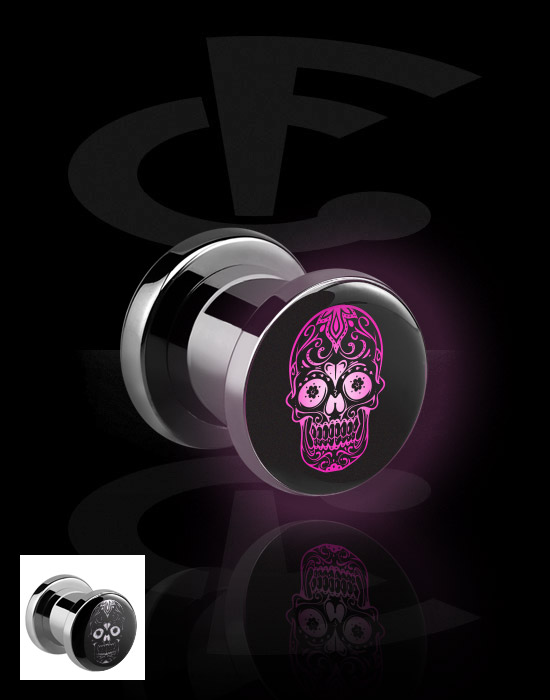 Navojni tunel (kirurško jeklo, srebrn, sijoč zaključek) s/z nastavkom LED in dizajnom črno-bele sladkorne lobanje »Dia de Los Muertos«