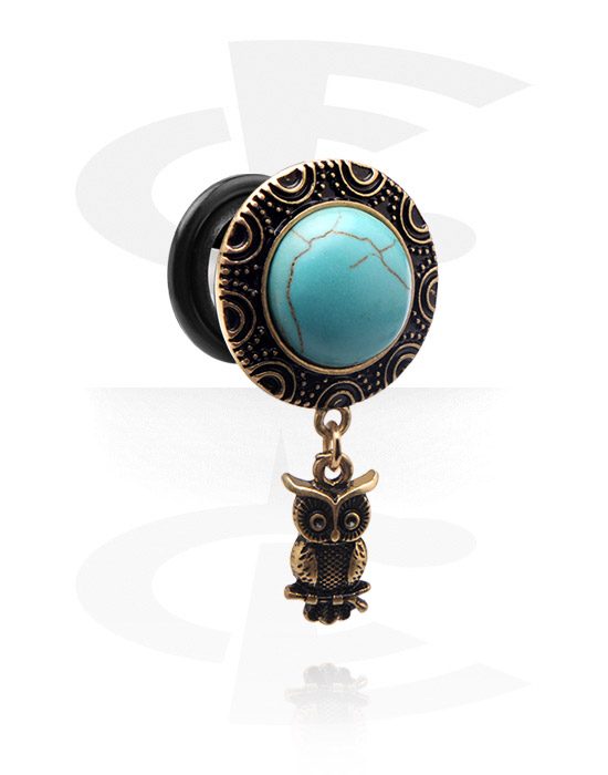 Single flared plug (surgical steel, silver, shiny finish) med vintage design och ugglehängsmycke