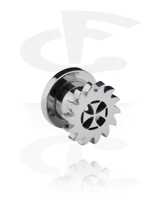 Läcker flesh tunnel i kirurgiskt stål med ett malteserkors och sågklinga. Ser ganska vass ut!
