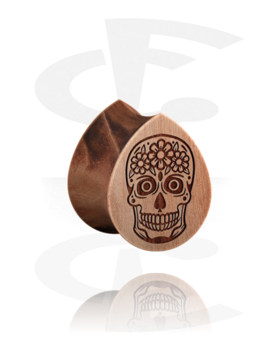 Tear-shaped double flared plug (wood) med sugar skull "Dia de Los Muertos" design