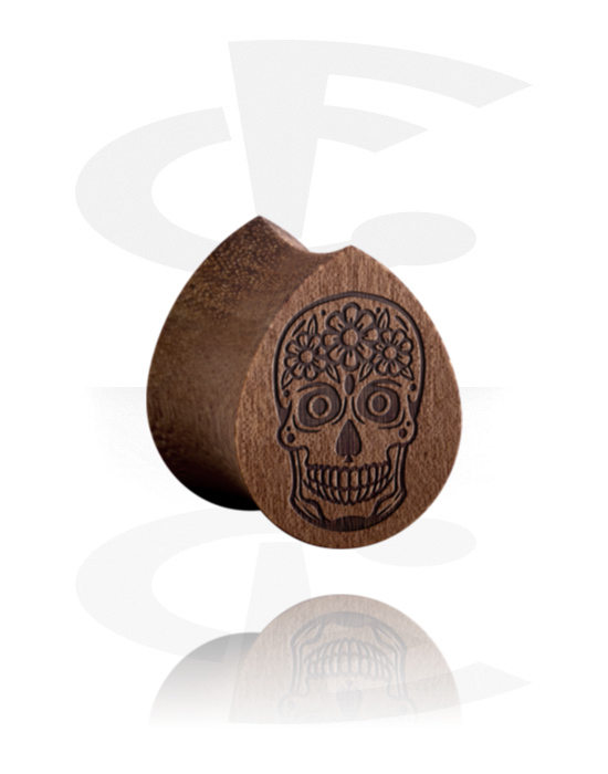 Tear-shaped double flared plug (wood) med sugar skull "Dia de Los Muertos" design