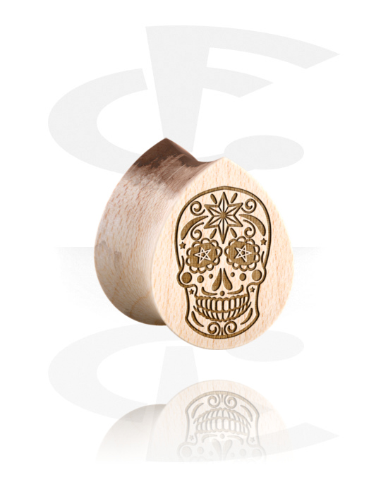 Tear-shaped double flared plug (wood) med sugar skull "Dia de Los Muertos" design
