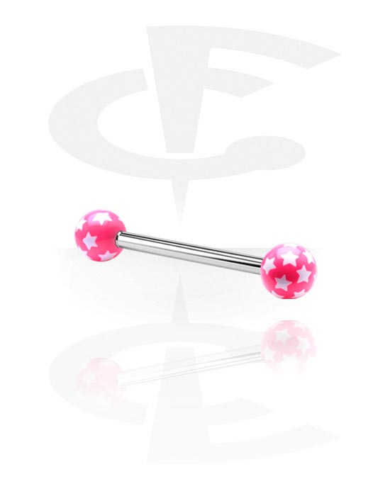 Steel barbell with threaded balls featuring tiny stars all over. A funky style for your tongue or ear piercings. On stock and ready to ship in different lengths and colours.